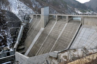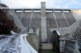 ・最高水位は、1月4日午後5時頃まで維持する予定ですので、ダム上部の非常用洪水吐きから水が流れ落ちるのが見られるのは、1月4日(水)のみとなります。ご了承ください。
